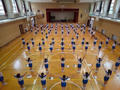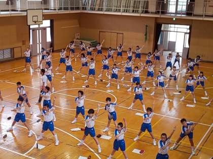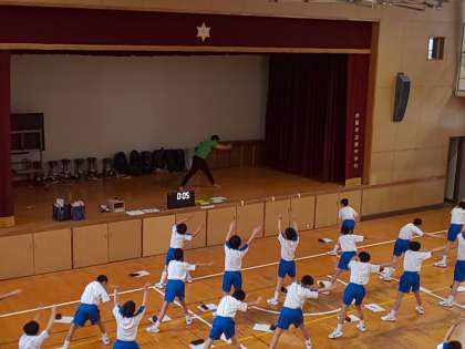 保健体育科の授業で取り組んだ集団行動の成果が学校生活の中で、徐々に成果がでてきました。次は東中伝統に東中体操です。体操は、けがの防止だけでなく、筋温を高めたり可動域を広げ、より良い動きを導き出す基本となります。