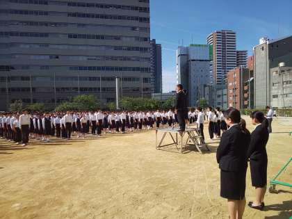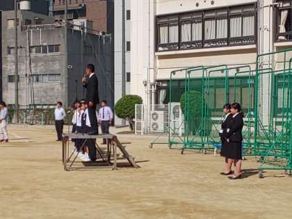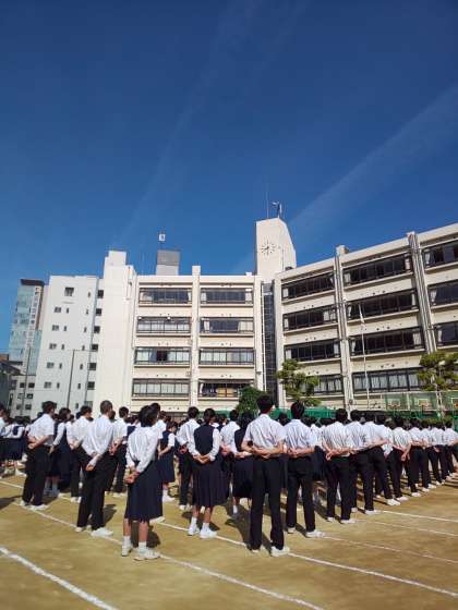 雲ひとつない青空の中、全校集会が行われています。