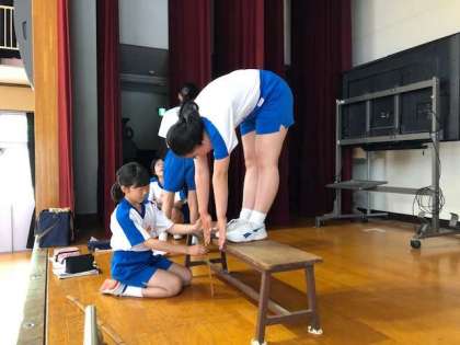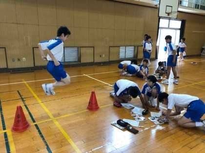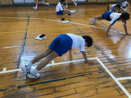 3時間目2年生3・4組の体育では「体つくり運動」に取り組んでいます。体つくり運動も後半になり、今日は班わけをして腕立てサークル、ゴム跳びサイドジャンプ、馬跳び股下くぐり、ハードル連続ジャンプ、インターバル走、立位体前屈の6項目にチャレンジしています。