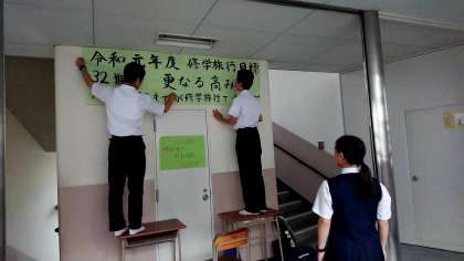 修学旅行実行委員のみんなが協力して、先日決まった、令和元年度修学旅行目標を大きな模造紙に筆ですごく丁寧に書いてくれました!