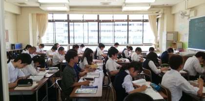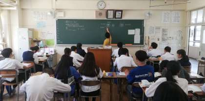 1組では理科の授業が行われています。海美中学校の皆さんも一緒に学習しています。