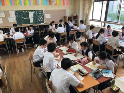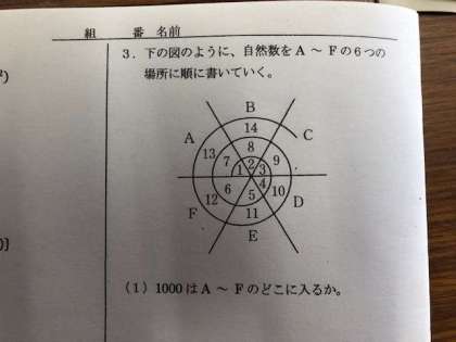 2年3組の1時間目は数学で「文字式の利用」について学習しています。プリントを活用して難解問題に班でチャレンジしています。
