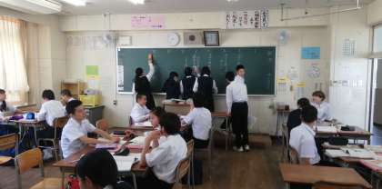 写真は、その発表として班で話し合ったことを黒板に書き、意見交流をしているところです。