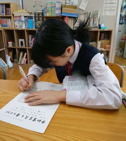 授業では、朝学活で取り組んでいた、3年生「修学旅行 平和宣言文」の続きを書いています。分からない漢字は辞書で調べながら記入しています。