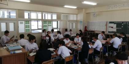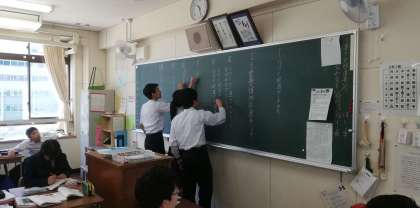 グループワークで話し合ったことを、黒板に書き、クラス全体で共有しています。