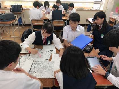 タブレットや地図を活用して班別にスケジュールの計画を立てています。