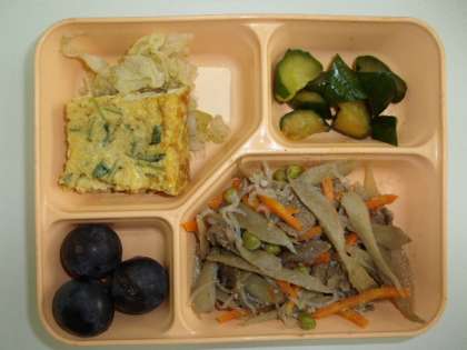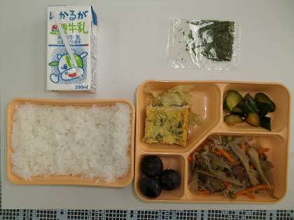 今日の給食は、ご飯のうえに牛肉きんぴらちらしをのせて、丼?まぜご飯?風にして食べれるメニューでした。子どもたちが給食を美味しく食べることができるよう、工夫されている一つなのかもしれません。なかなか美味しかったです!