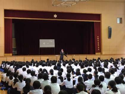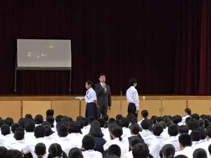 校長先生からその中の「いじめについて考えれ日」について少し触れます。生徒会の皆さんは「いじめは何か問題や背景があるから起きる問題ではありません。ちょっとしたきっかけでいじめは起き、広がってしまうことでしょう。いつも相手の立場になって考えることはいじめの未然防止につながります。」とあります。皆さんは普段から相手の立場になって物事を考えていますか!?この気持があれば決していじめは起こらないし、万一起こっても周りの仲間や自身が必ずなくすために行動ができます。今、学級代表の人に向かい合い、その後背中合わせになってもらいました。向き合っているときは、相手の瞳や表情がわかります。相手が何を考え、またどんな気持ちをしているかがわかります。しかし、背を向けてしまうと、相手の表情や様子、気持ちの変化も何もわかりません。顔を合わせるためのその距離は地球1周分にもなってしまいます。皆さんは仲間とどんな関係になりたいですか?どんな仲間が必要ですか?人は一人では生きていけません。自分自身が豊かに、そして周りの仲間と良好な関係を築いていくには、「相手の立場になって考え、理解し行動する」ことが何よりも大切なのです。そして、心から信頼できる仲間になり、心から信頼される自分になりましょう!