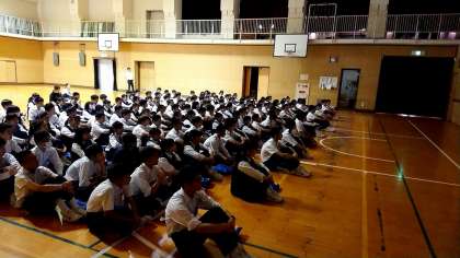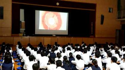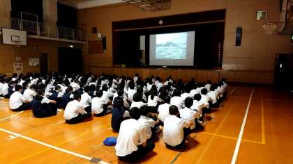 本日5・6限目を使って、長崎平和学習としてまずは体育館に集まり原子爆弾の爆風や威力について映像をつかって学んでいます。