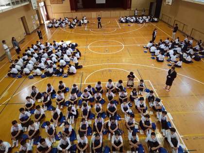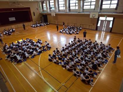 6限 1年生は体育館で一泊移住の係別会議を行っています。それぞれの係の先生方から係別の役割内容について、説明を受けています。班の代表として、しっかりと話を聞き、一泊移住を成功に導いてほしいと思います。