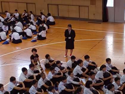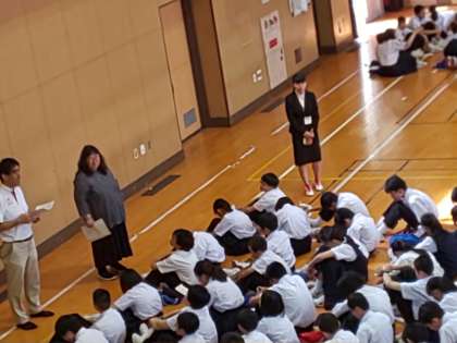 6限 1年生 一泊移住係別会議に参加している教育インターンシップの学生も先生方の的確な説明を一生懸命に聞いています。