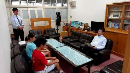 男女のソフトテニス部の部長と顧問の客本先生が校長先生のもとを訪れています。