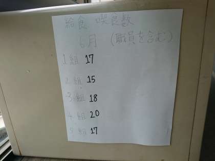 1年生の喫食数を生徒が書いてくれました。それを1年生のフロアーに掲示しています。喫食数を把握することができ、配膳する時にとても便利です。ありがとう!
