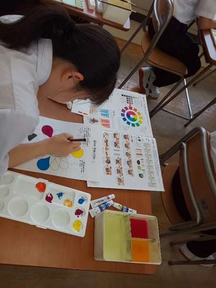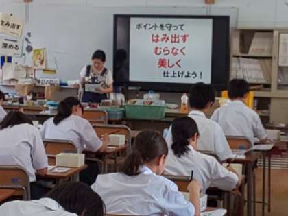 1年2組 美術の授業では、電子黒板を活用し視覚的にもわかりやすい授業の展開しています。教室の後ろからでもしっかりとポイントが読み取れます。