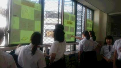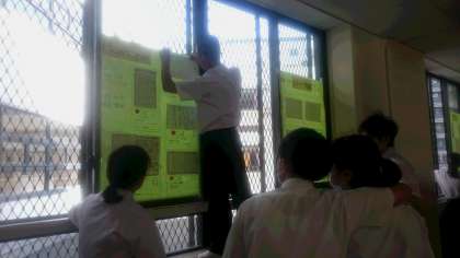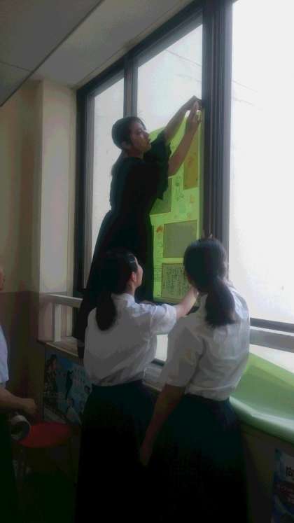 今朝は、昨日完成させた修学旅行の事前学習の「長崎を知る壁新聞」を掲示しています。早くから集まり、副班長を中心に互いに協力しあって作業をしています。