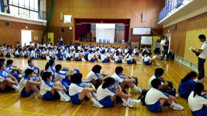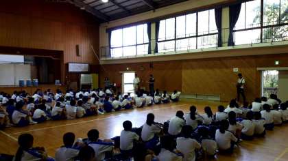 体育館では、各部屋への移動、その後の予定について説明を聞いています。