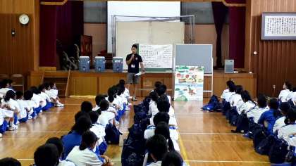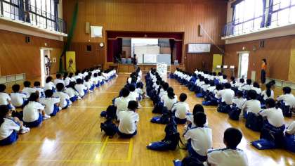 体育館では、1、2、3組がフォトウォークラリーの説明を聞いています。