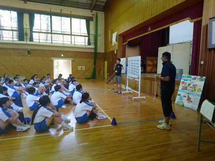 野外学校のスタッフの方より説明をうけています。フォトマップに示されたルートを探しながら、5つの問題に挑戦します。