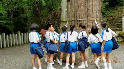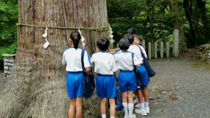 桜木神社の御神木の前にみんな集まっています。大きさに圧倒されてしまいます。