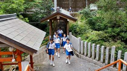 問題のヒントは境内の看板にありますよ。しっかりと解答してください。