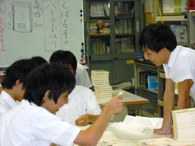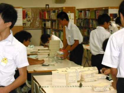 そのため、9月20日(土)授業参観の日、図書委員、作業を手伝おうという有志の生徒たちにより本一冊一冊にバーコードをはりました。