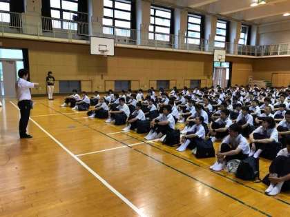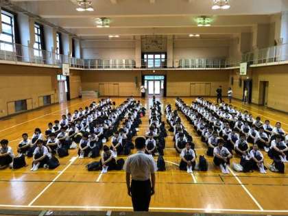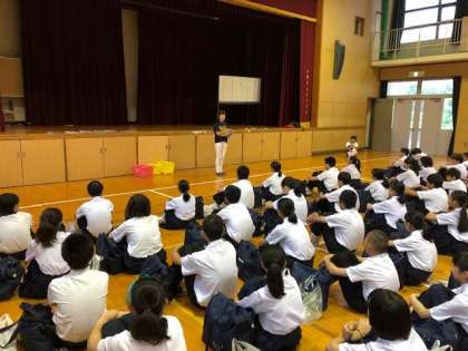 今回の校外学習は各班でタブレットを活用して、各施設での学習の記録を行います。あいにくの天気ですので、雨天時のタブレットの使用についての再確認と学年主任の山口先生から出発前に諸連絡と目標の再確認がなされています。