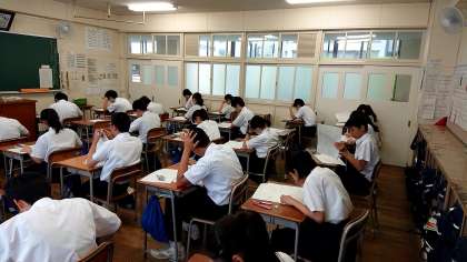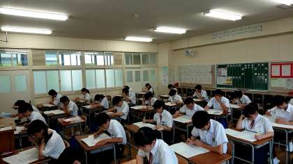 1組は3限目の英語はブライアン先生の授業でしたが、朝から数学、国語に続いて3つめの社会科のテストを行っています。