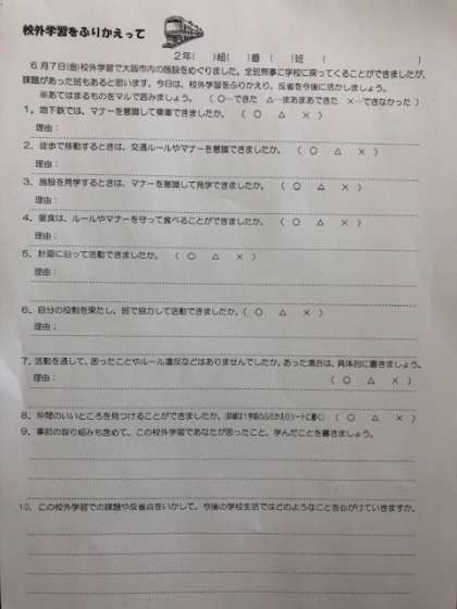 5時間目の総合学習では、金曜日に実施をした校外学習の振り返りをワークシートを活用して行っています。