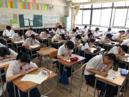 続いて各班で壁新聞づくりに取り組みます。今回はタブレットを活用して資料を集めていますから完成が楽しみです。頑張れ2年生!