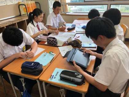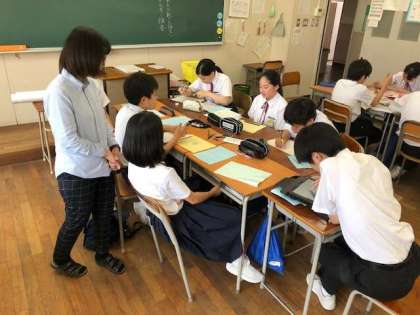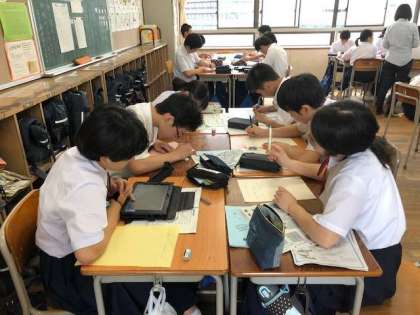 6時間目には班ごとに壁新聞づくりに取り組んでいます。班の中でも役割分担をして、見学した施設で学んだことを、各自が1枚の紙に記事をまとめます。それを班ごとに大きな模造紙にまとめて完成です。