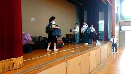 また、体育館の舞台には明日の準備物をつめた旅行カバンを持った3年生がぞくぞく登校しています。いよいよ明日に迫った修学旅行への取り組みもあと少しです!