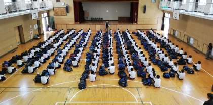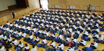 学年主任の山田先生より、修学旅行前最後の講話です。何を目的に行くのか、ルールを守ることの意義について話がありました。