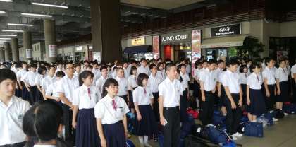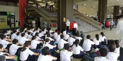 整列の様子と修学旅行実行委員会副委員長の挨拶の様子です。