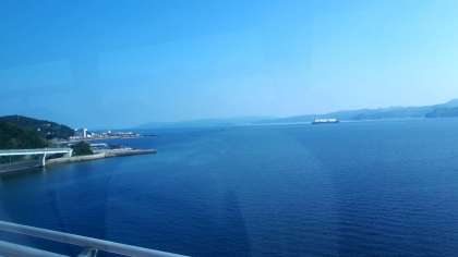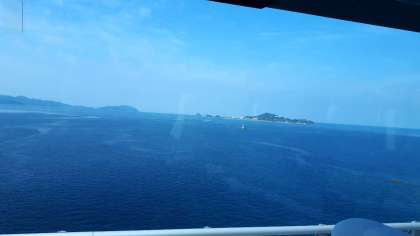 ホテルを後にし、出発しました。バスの右側のはるか遠くに軍艦島が見えます。