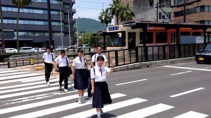 午後は、平和公園駅から路面電車で来て出島駅からのスタートです。一番の班がやって来ました。