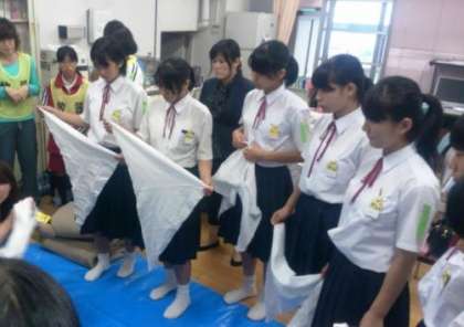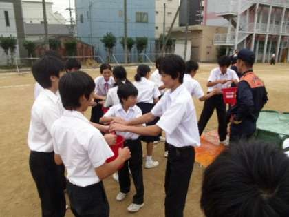 グランドではバケツリレーなどの体験コーナーもあり、地域の方々と協力しながら取り組むことができました。