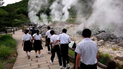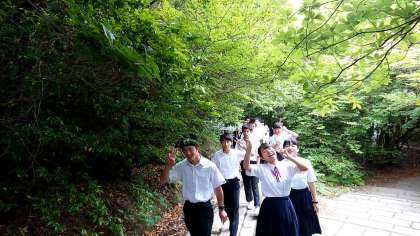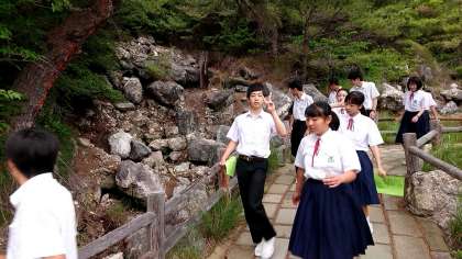 清々しい天気の中での朝散歩です。しかし、みんなは硫黄のにおいに「おえ〜」「くせぇ〜」といった声が聞こえてきます。中には「このにおい悪くないやん」という生徒もいました。