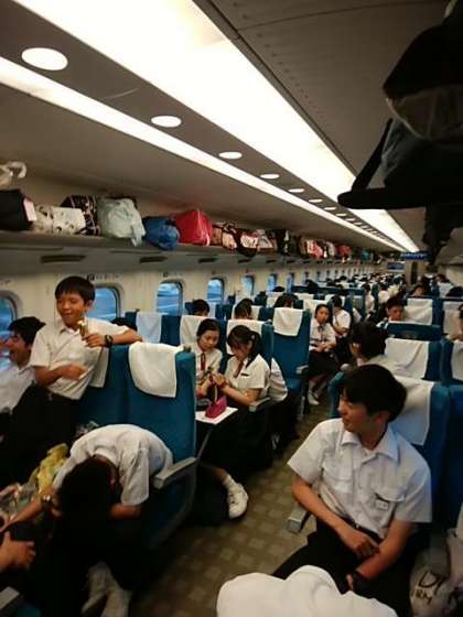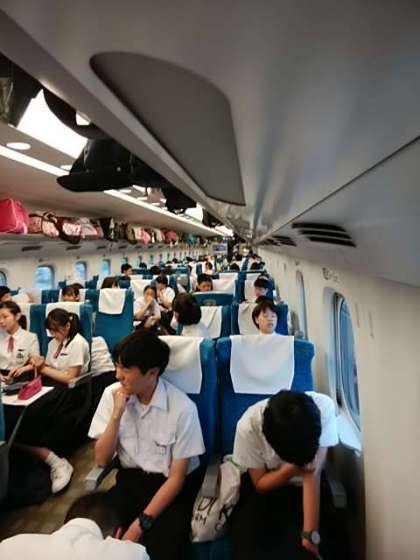 新幹線は岡山を出ました。生徒たちの車内交流の熱気は、まだまだ冷めません。