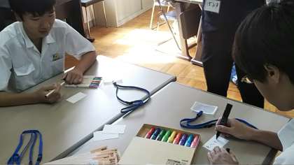 名札を作りながら「人見知りする…」と不安がっているところに、スタッフの大学生が話しかけてくれました。府内の小・中・高校生がたくさん参加しています、積極的に頑張ってください!