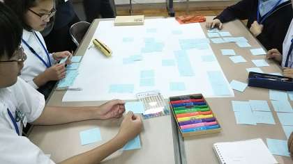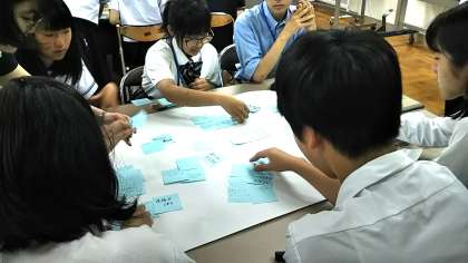 最後に各班の発表を評価し、投票で順位を決めるそうです。商品もあると聞いて真剣に作業にとりかかっています。