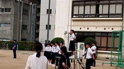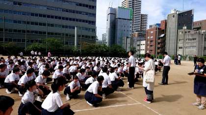 全校集会が始まる前に、3年生の修学旅行実行委員会副委員長(委員長は生徒会長なので朝礼台の上)より学年みんなに、「先週修学旅行でたくさん学んだことを、今後の学校生活に生かして頑張っていきましょう!」との決意が述べられました。