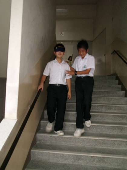 1については、アイマスクを付けた状態で、介助役の生徒とペアを組み、校内を移動するというものです。その途中には階段を上り下りする移動もあるため、体験者は介助者の声を聞きながら、一歩一歩慎重に歩いていました。