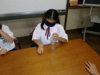 2については、ペットボトルのふたを開けてクリップを入れる活動や、穴の空いた厚紙にひもを通す活動を行いました。視覚に頼ることができないので、子どもたちは手先の感覚を十分に使いながら進めていました。