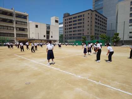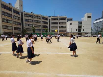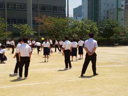 2年3組は、男女が一緒になってドッジボールを行っています。