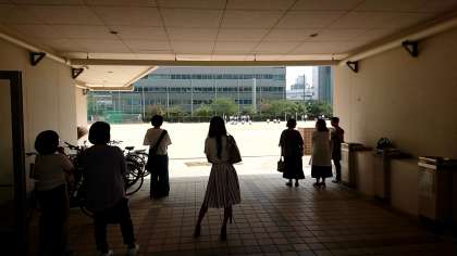 いい天気の中バレーボールのサーブ練習が行われています。保護者の方々は体育館の横から見ておられます!