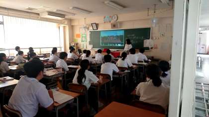 4組は白戸先生の公民のです!映像を見せて興味をひく授業を行っています。現代社会の科学技術の発達について学んでいます。