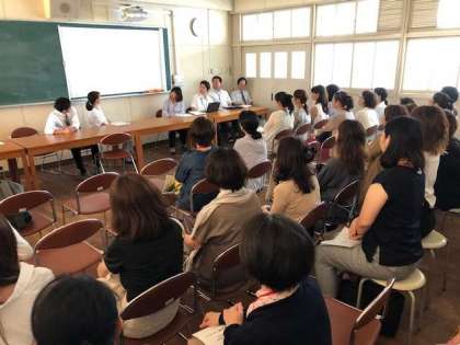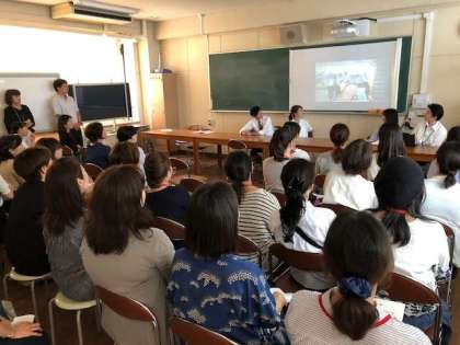 授業参観後に会議室にて、2年生の保護者集会が実施されています。学年主任の山口先生から現状報告があった後に、先日実施された校外学習のスナップDVDを鑑賞しています。生徒たちのユニークな姿に盛り上がっています。