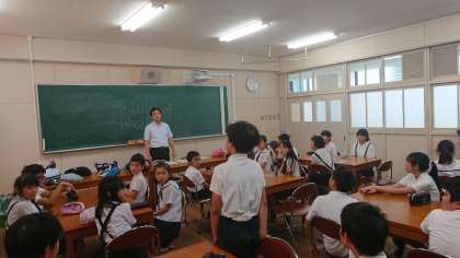 小学校で習っている社会の内容を発表したり、各グループで自己紹介、グループ名を決めています。