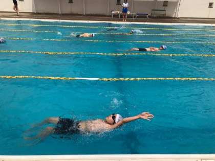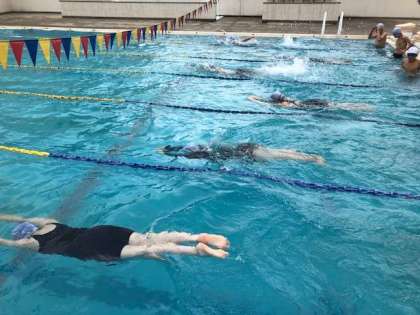 今日はストリームライン姿勢の学習と自由形、平泳ぎ、背泳ぎの記録測定を行っています。頑張れ2年生!