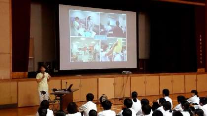 スライドを使って、わかりやすくお話をしていただいています。まずは本日の講師である大野先生より看護師の仕事についてのお話から始まりました。